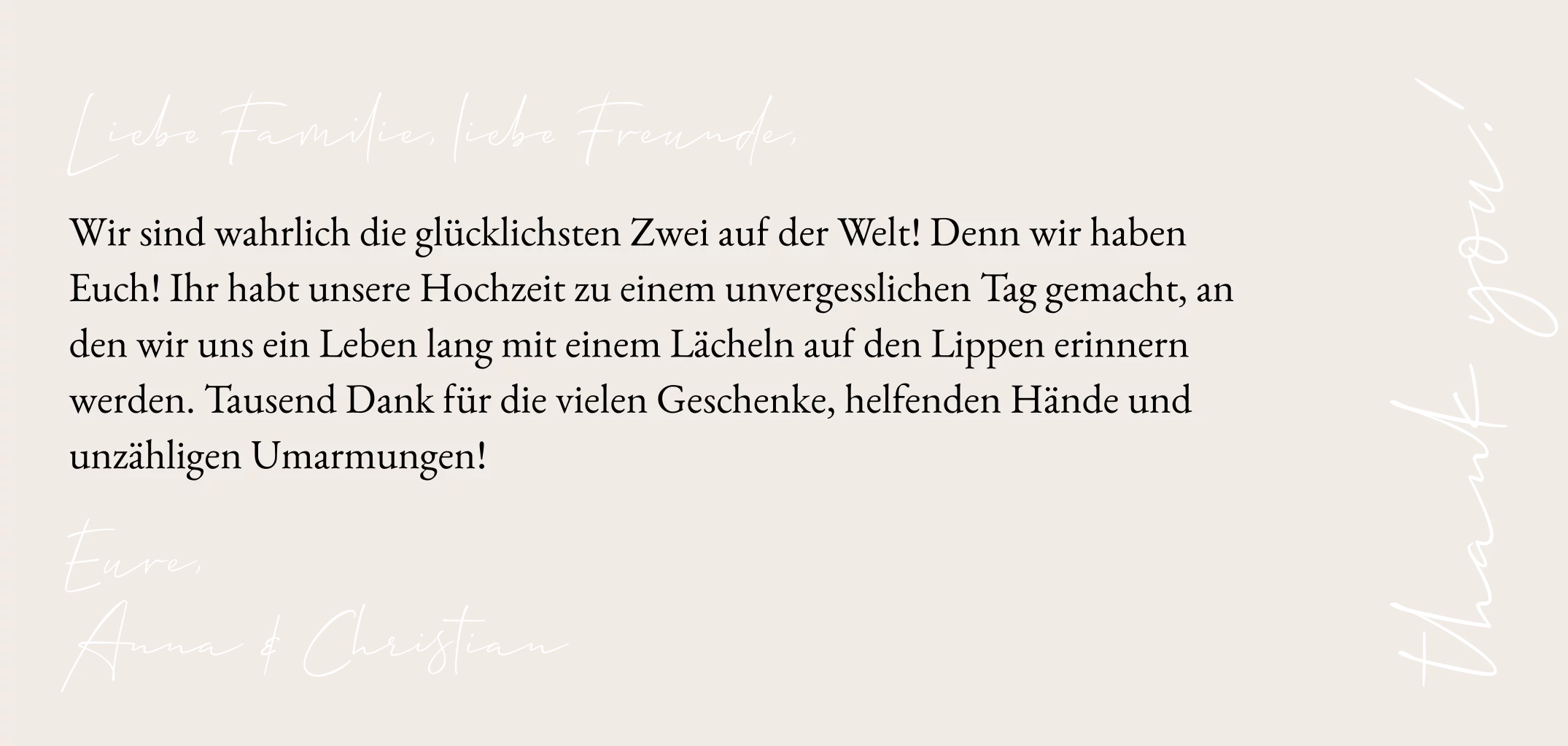 Schlichte Danksagungskarte zur Hochzeit in beige. Die Karte im Panoramaformat mit gestempelten Lebensmitteln in schwarz auf der Rückseite macht diese Karte zu etwas außergewöhnlichem. Der mit Folie veredelte Stempeldruck erzeugt einen modernen und gleichzeitig edlen Touch.