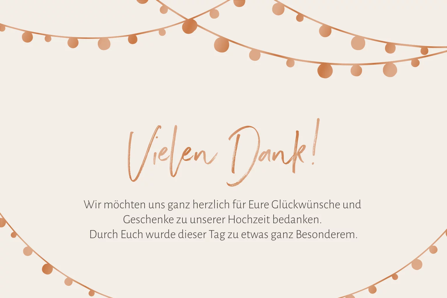 Veredelte Dankeskarte zur Hochzeit in beige mit Lichterkette in Kupfer mit Gloss