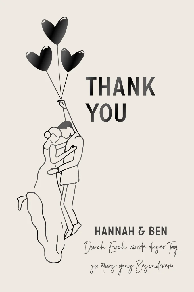 Dieses einzigartige Design einer Dankeskarte zur Hochzeit in beige mit einem fliegenden Brautpaar aus schwarzer Folie und Herzluftballons ist perfekt um Danke zu sagen.