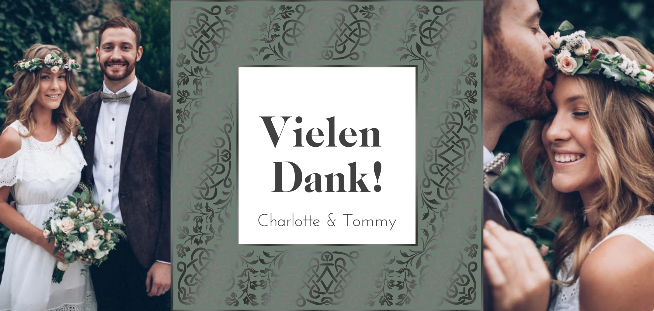 Grüne Danksagungskarte zur Hochzeit mit schwarzem Muster und Fotos