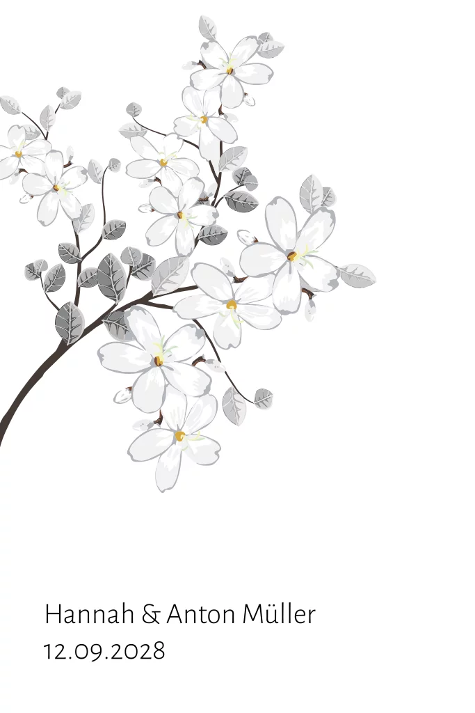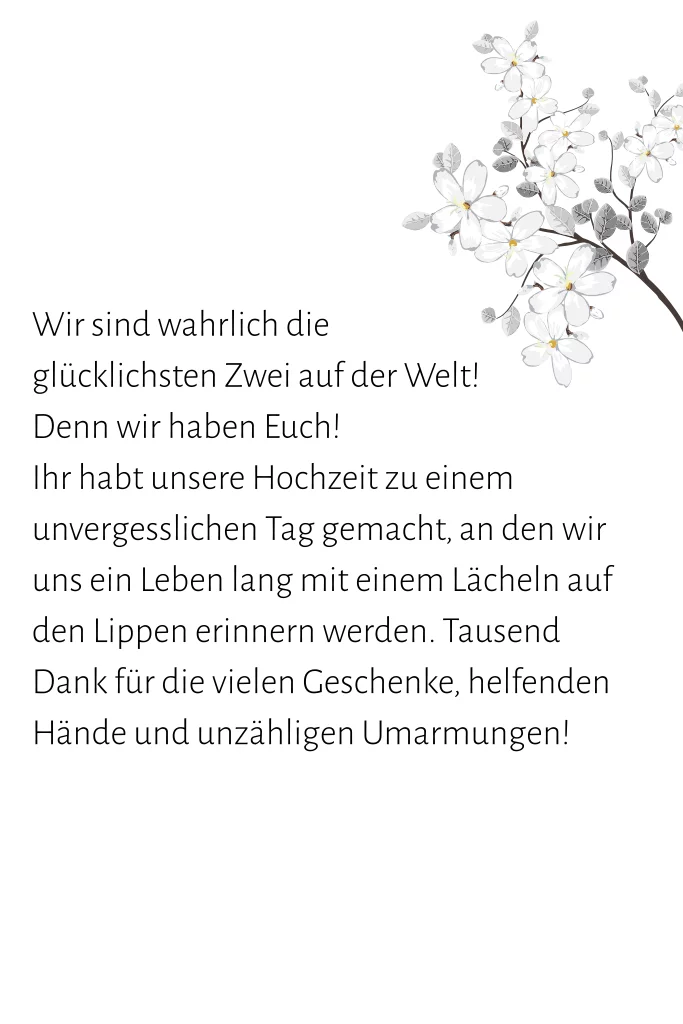 Veredelte Danksagungskarte zur Hochzeit mit weißen Kirschblüten. Die weiße Klappkarte hat Platz für ein Foto auf der Innenseite.