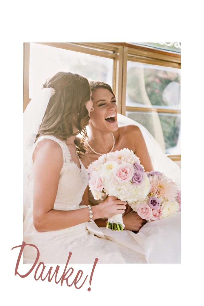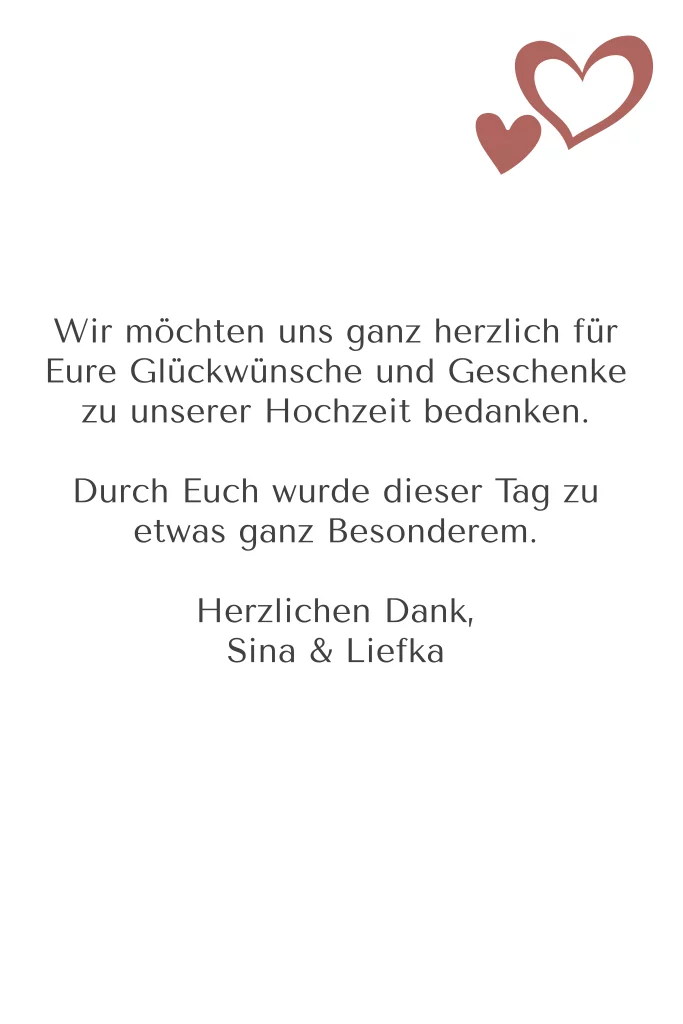 Eine niedliche Karte um den Hochzeitsgästen Danke zu sagen. Danksagungskarte mit Herzen im Unendlich-Zeichen und Foto.