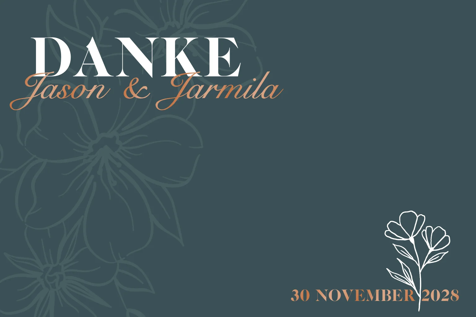 Dunkelblaue Klappkarte zum Danksagen an Eure Liebsten. Die Danksagungskarte wird mit zarten Line Art Blumen und Kupferfolierung verziert.