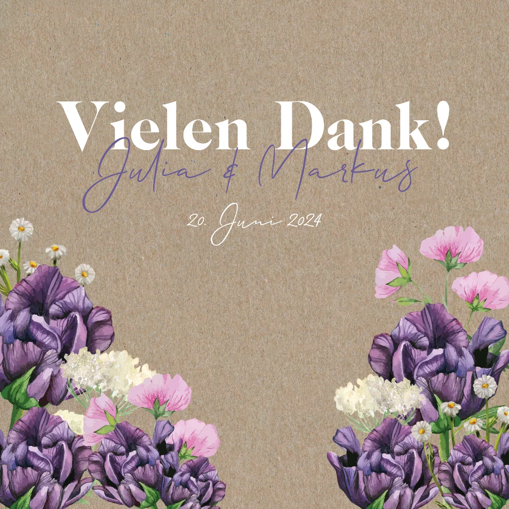 Quadratische Dankeskarte zur Hochzeit mit lila Blumen auf Kraftpapier