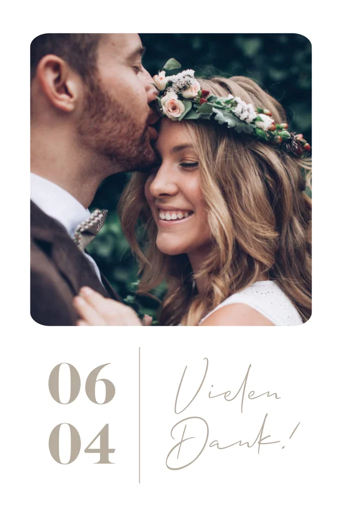 Moderne Danksagungskarte zur Hochzeit mit abgerundeten Ecken und Fotorahmung. Die weiße Karte im Postkartenformat ist mit Schrift in beige gestaltet.