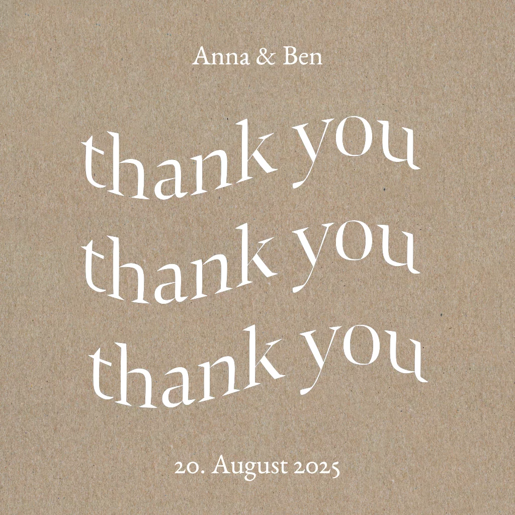 Quadratische Kraftpapierkarte mit geschwungenem weißen Schriftzug: Thank you, Thank you, Thank you - weil man einfach nicht oft genug Danke zur Hochzeit sagen kann.