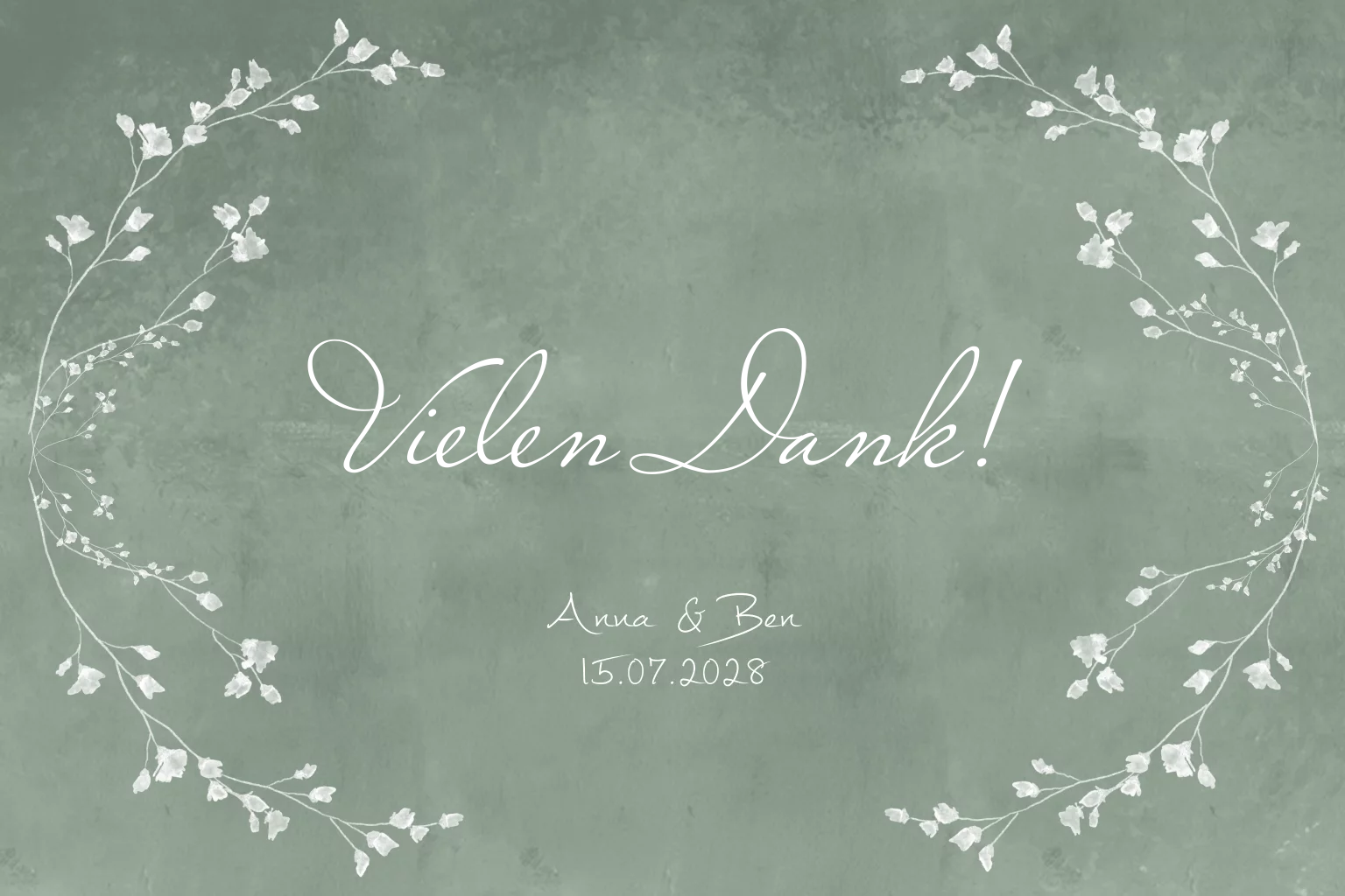 Grüne Danksagungskarte mit zarten Blumenranken in weiß