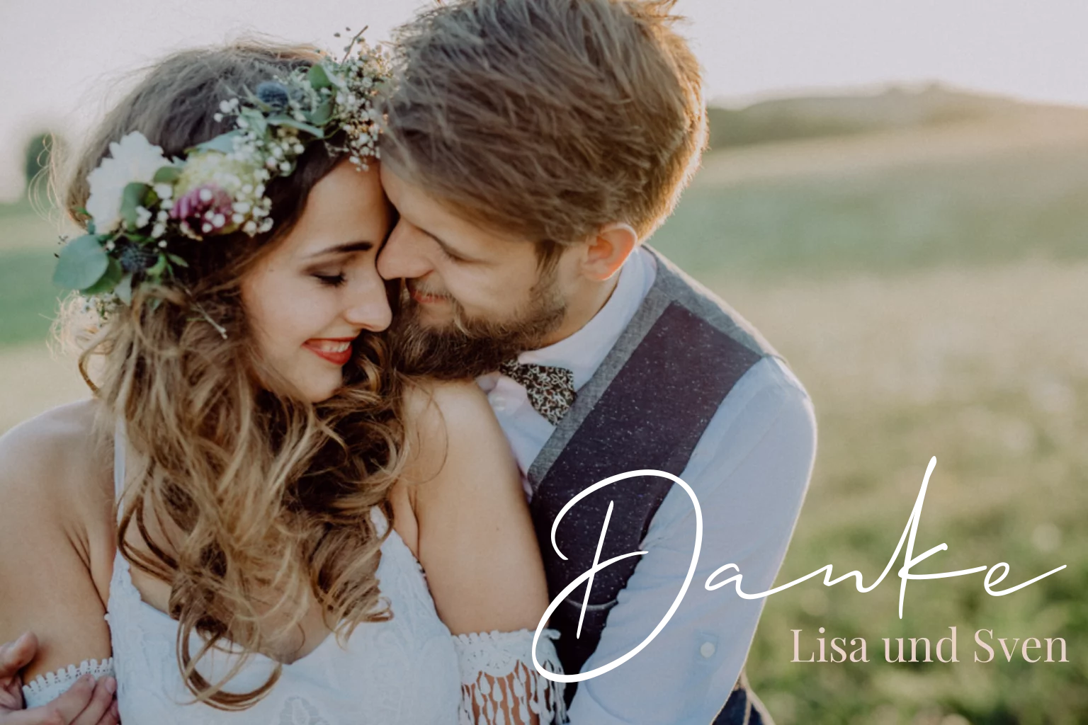 Ein Foto Eurer Trauung, der Schriftzug "Danke" in Gold Veredlung und Eure Dankeskarte ist fertig.