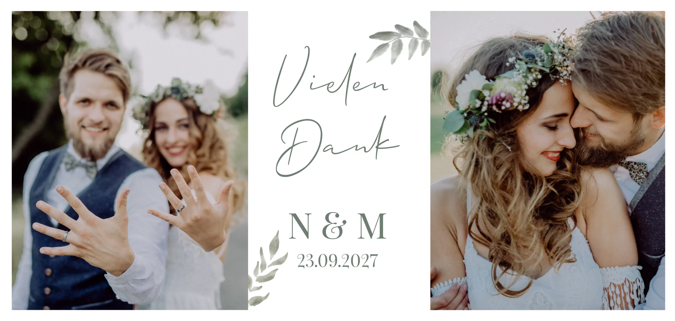Natürliche Danksagungskarte mit grünen Aquarell-Zweigen und Platz für Fotos.