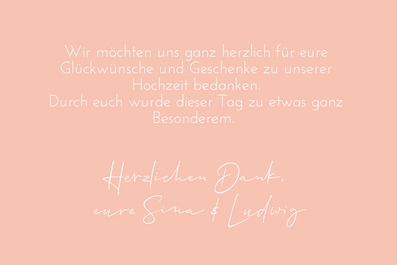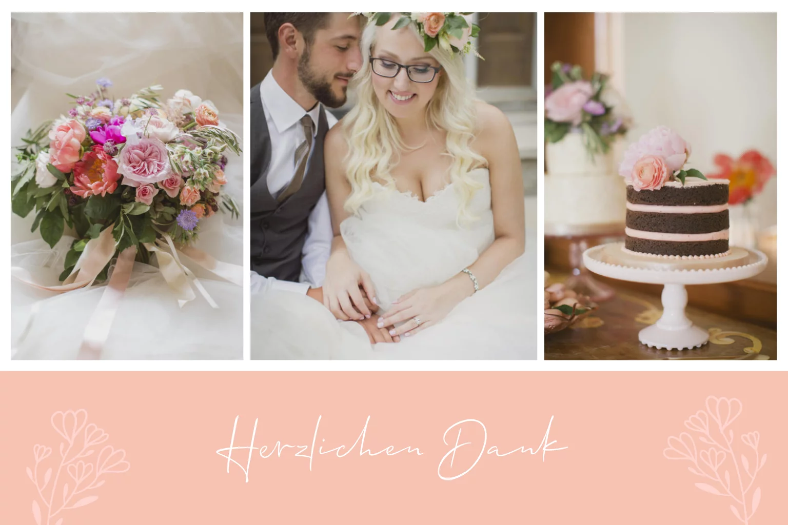 Mit dieser verspielten Dankeskarte im Klappkarten Format könnt Ihr Euren Gästen die ersten Eindrücke von Eurem großen Tag wiedergeben.