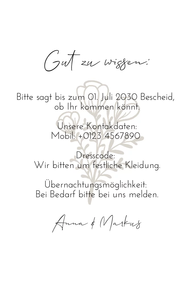 Weißes Einlegeblatt zur Einladungskarte mit wichtigen Informationen zur Organisation der Hochzeit. Die schlichte weiße Karte im Hochformat mit floralem Element in beige ist eine gute Möglichkeit wichtige Details gesondert zu platzieren.