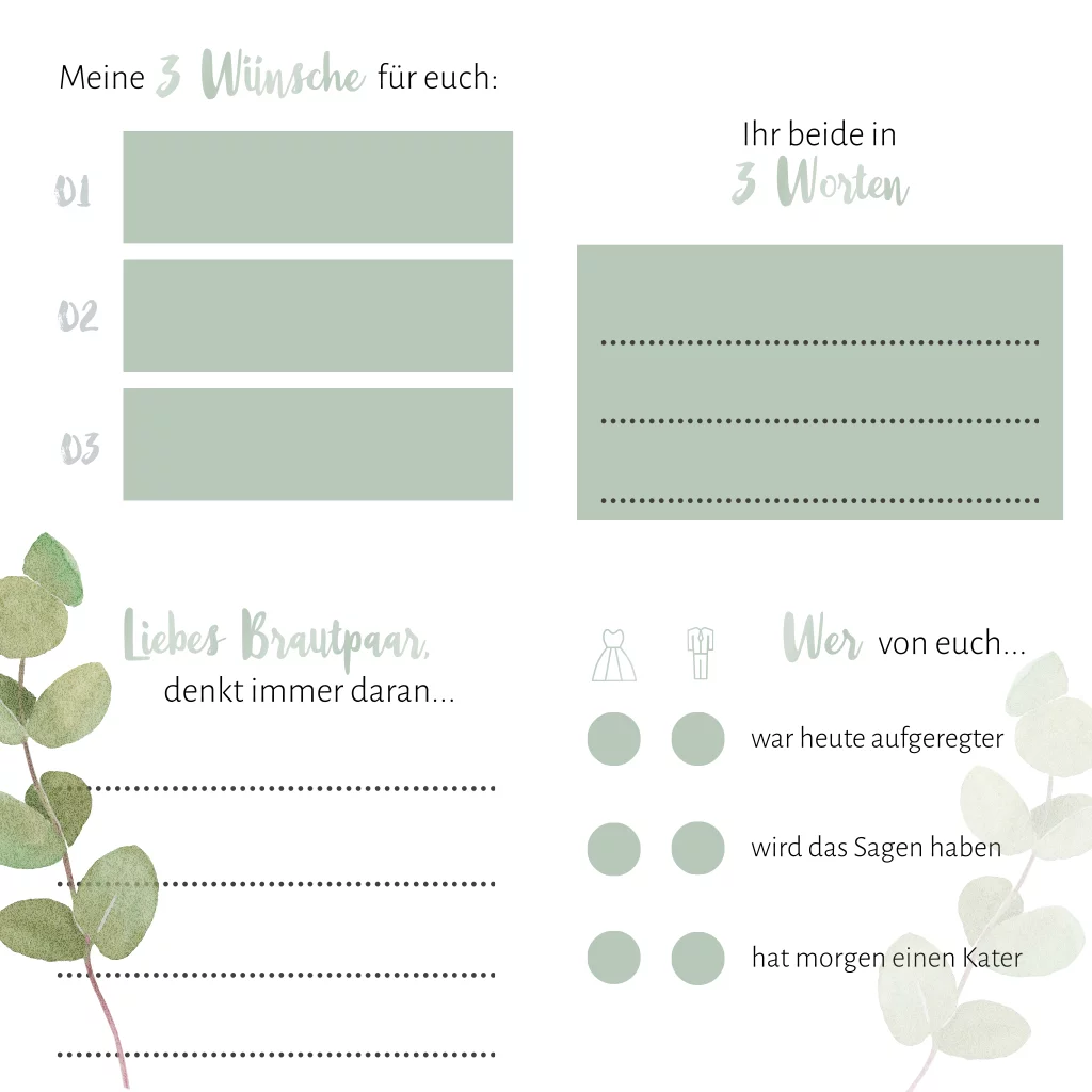 Veredelte Gästebuchkarte mit Blättern und Schriftzügen in graugrüner Glanzschrift.