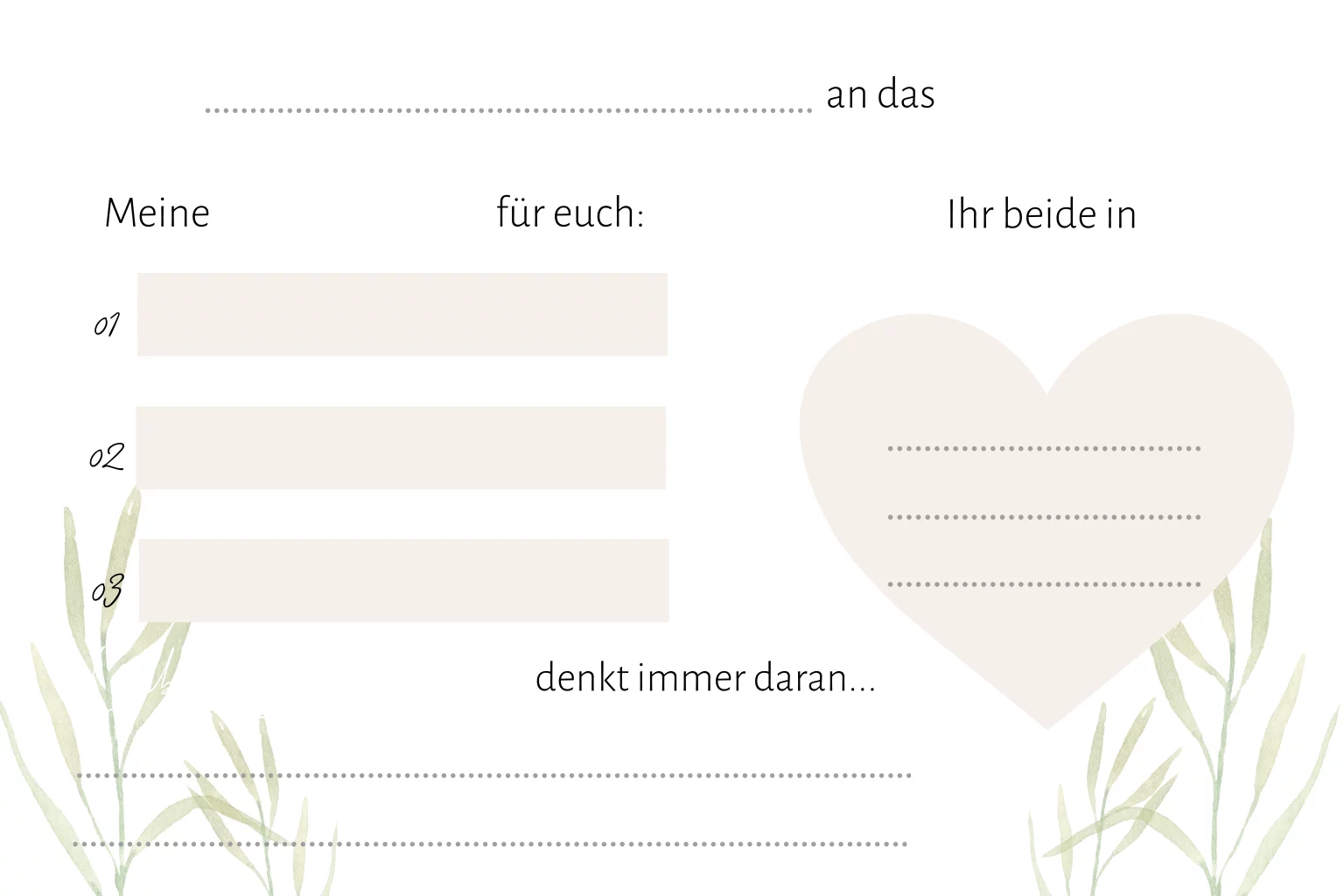 Veredelte weiße Gästebuchkarte im Querformat mit Greeneryzweigen und Goldfolie.