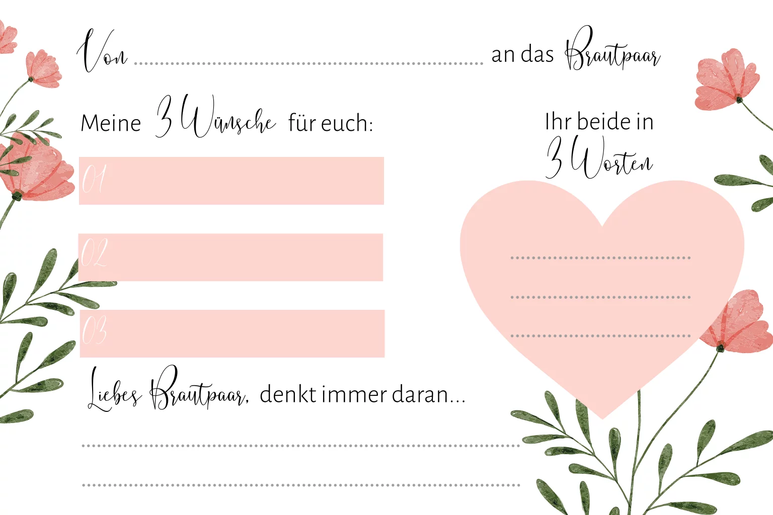 Verspielte weiße Gästebuchkarte mit rosa Blumen und Herz