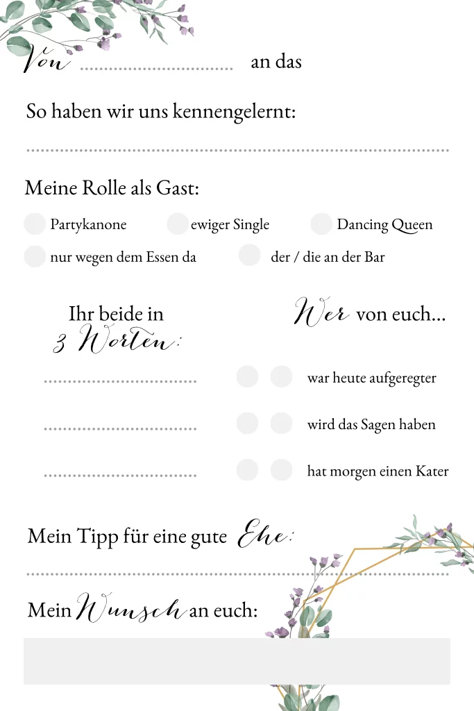 Veredelte Gästebuchkarte mit Zweigen und filigranem geometrischen Goldrahmen. Die weiße Karte im Hochformat ist eine schöne Alternative zum herkömmlichen Gästebuch.