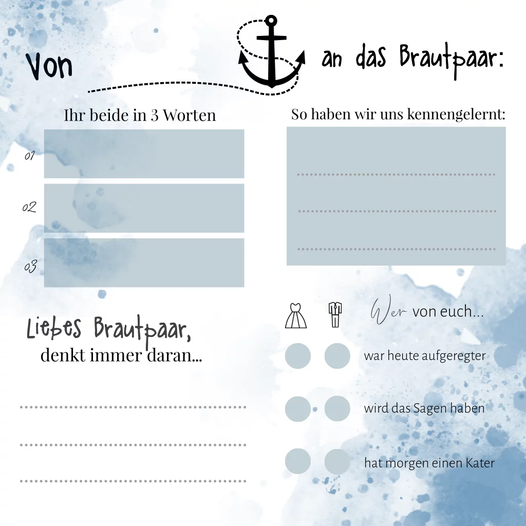 Maritime Karte als Alternative zu einem Gästebuch. Die quadratische weiße Karte mit aquarellem Hintergrund in blau passt perfekt zu einer maritimen Hochzeit.