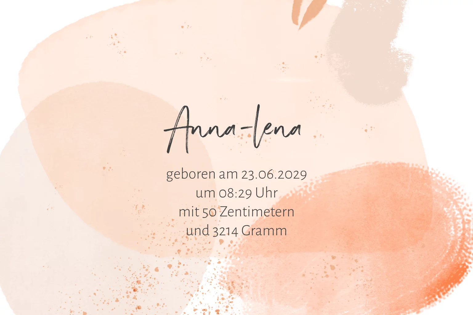 Geburtskarte mit Aquarellhintergrund in Orange, Apricot und Beige. Die weiße Postkarte im Querformat ist im modernen Stil gestaltet.