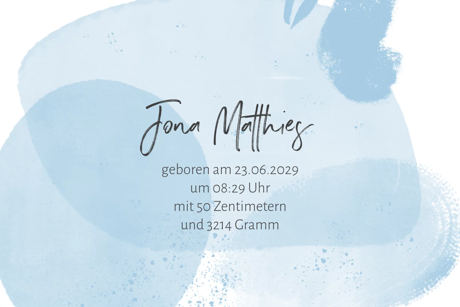 Weiße Geburtskarte mit Aquarell Hintergrund in Blau Nuancen