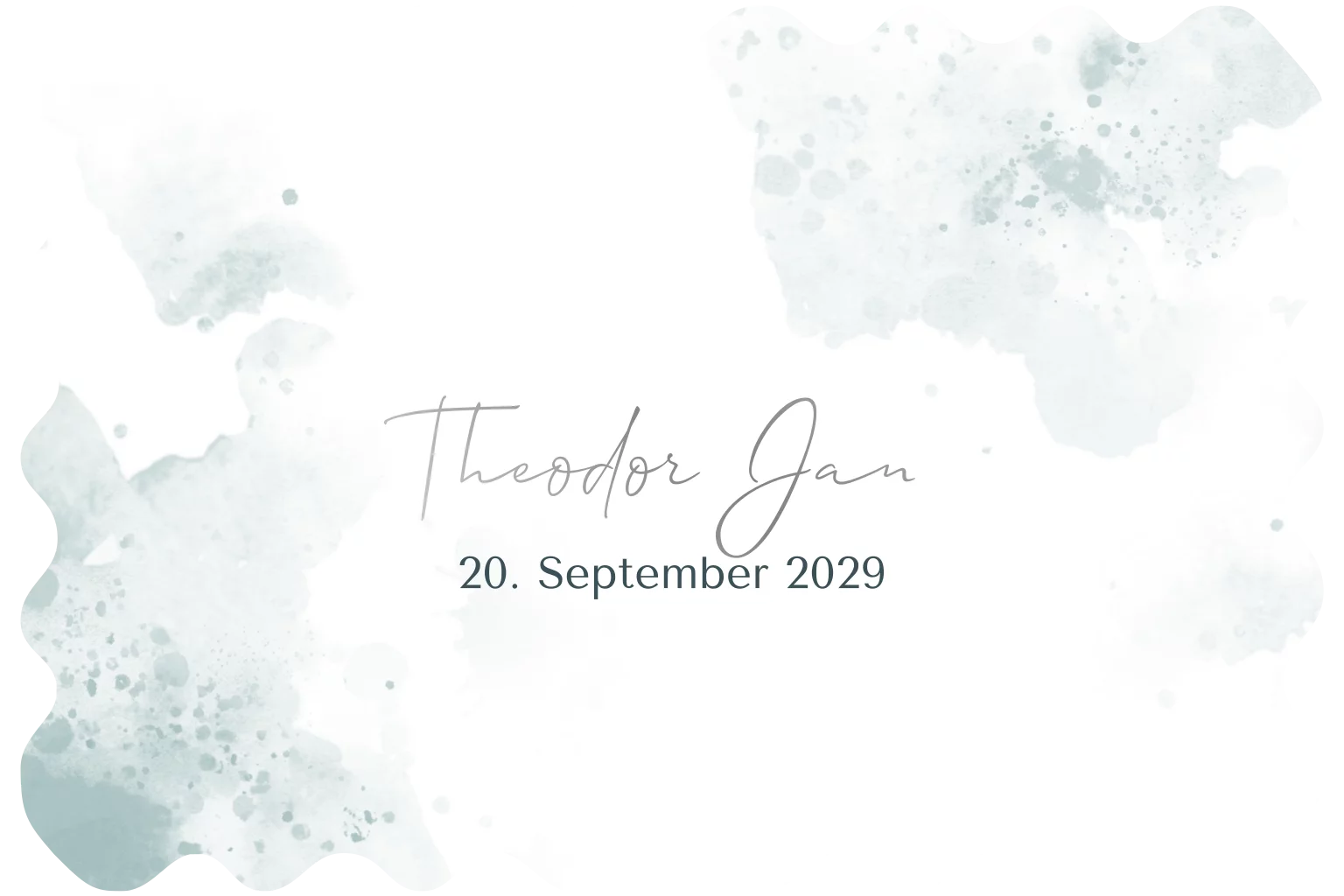 Geburtskarte mit blauem Aquarell und wellenförmigen Rahmen. Die weiße Postkarte im Querformat ist mit Silberfolie veredelt.