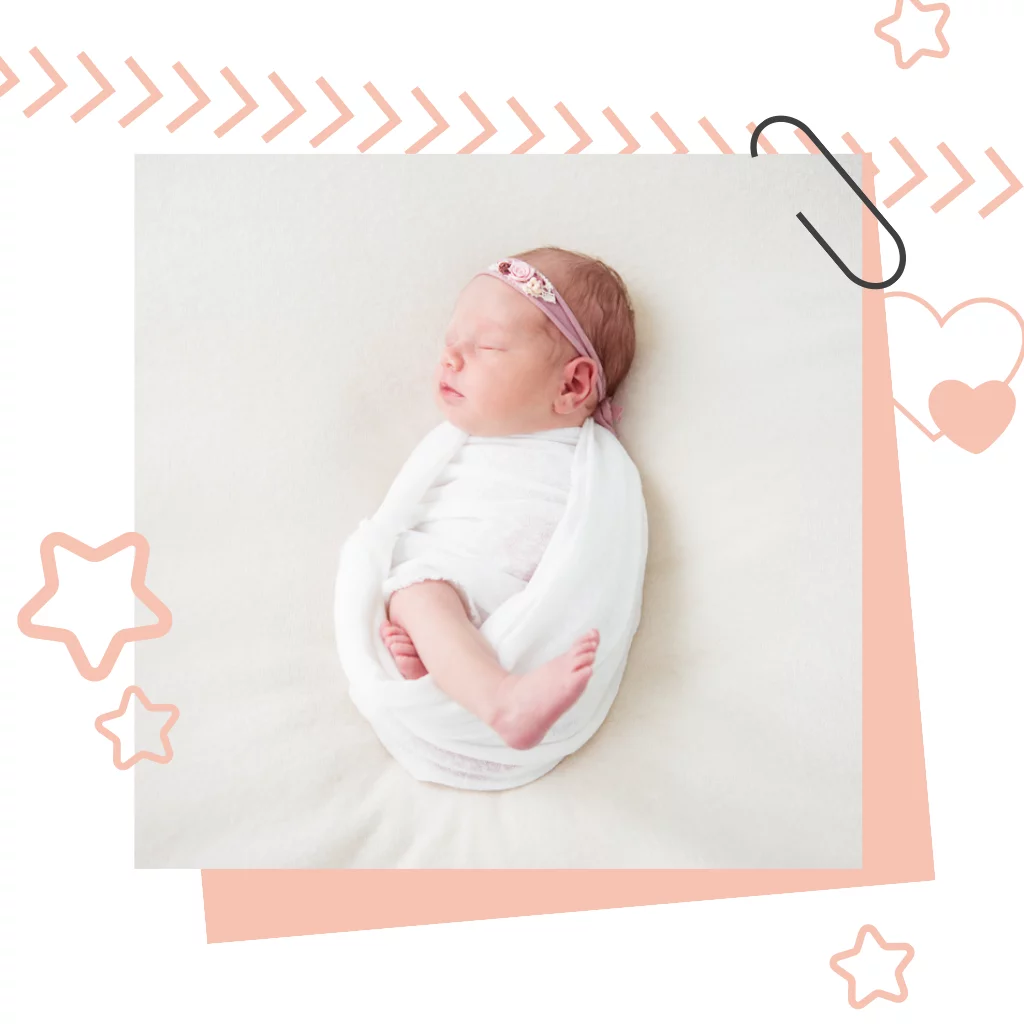 Geburtskarte mit Foto, welches auf der Vorderseite mit einer Büroklammer festgehalten wird. (Dieses Element ist gezeichnet und liegt nicht der Kartenbestellung bei.) Die weiße quadratische Klappkarte wird mit Herzen, Sternen und Pfeilen in Rosa geziert.