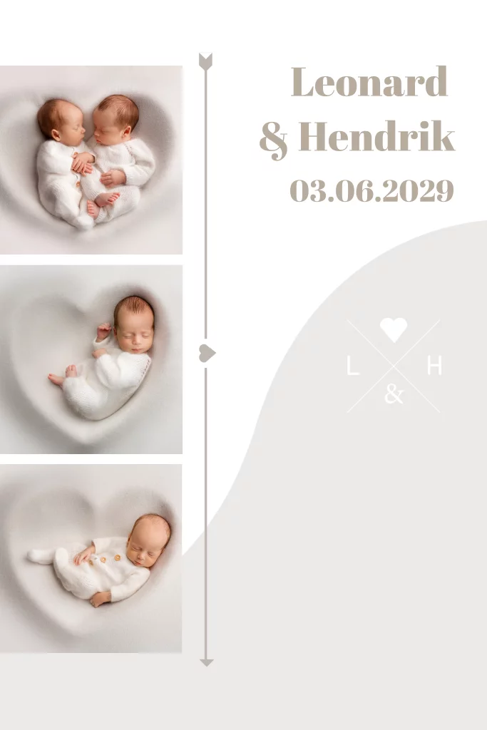 Schlichte moderne Geburtskarte für Zwillinge im eleganten Grau