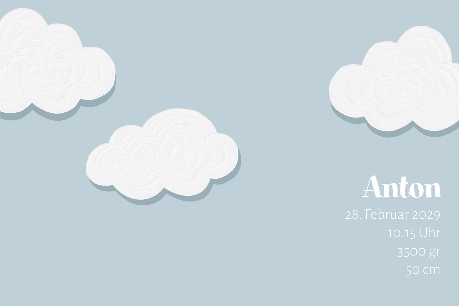 Süße Geburtskarte mit weißen Wolken. Die Postkarte mit abgerundeten Ecken in blau ist schlicht gestaltet.