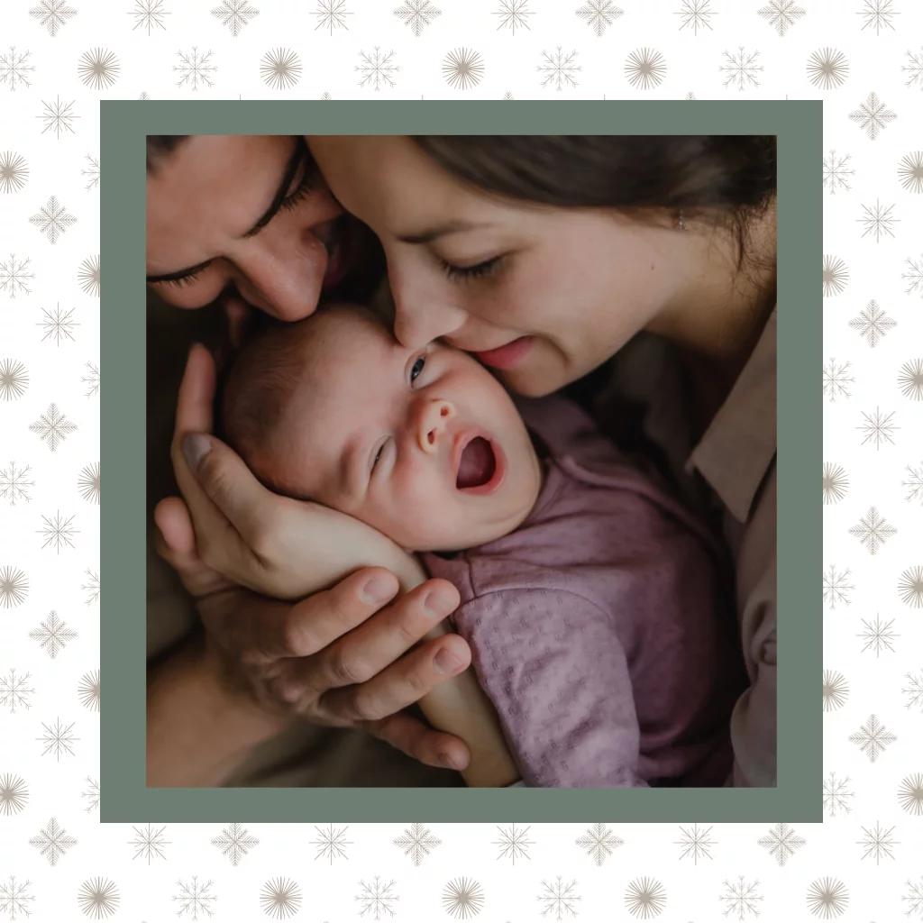 Winterliche Fotokarte mit Schneeflockenmuster in Grün und Beige ist eine liebevolle Geburtskarte und Grußkarte um schöne Festtage zu wünschen.
