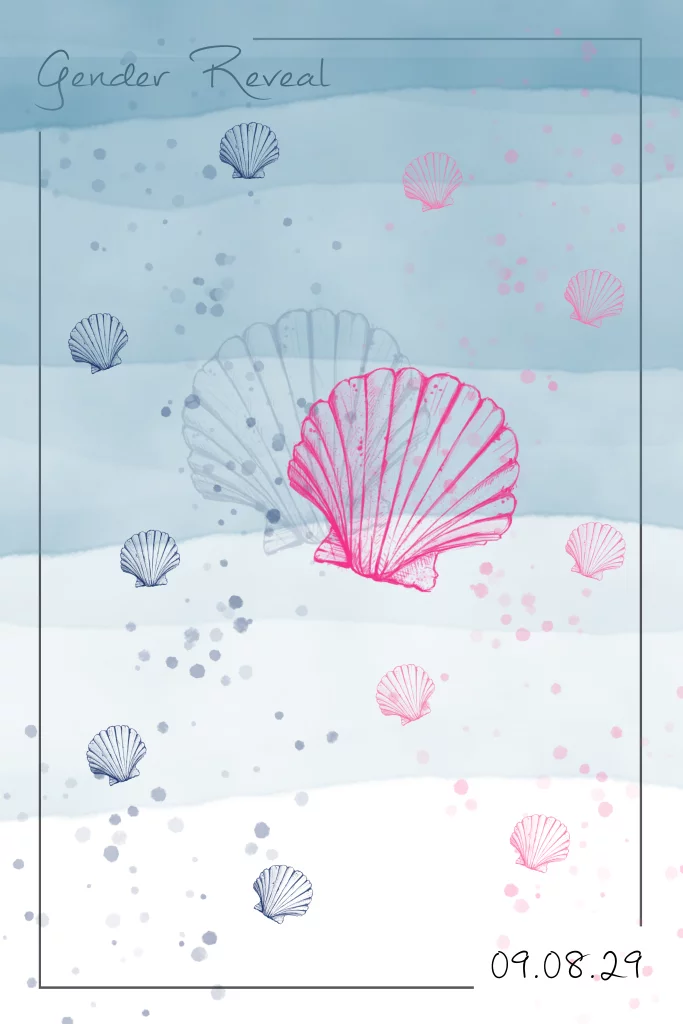 Ihr plant eine unvergessliche Gender Reveal Party am Strand? Unser Strandmotiv mit Muscheln in Pink und Blau ist die perfekte Wahl für Eure Feier! Die liebevoll gestaltete Postkarte zeigt ein Aquarell Strandmotiv und ist mit niedlichen Muscheln und Sprenkeln verziert.