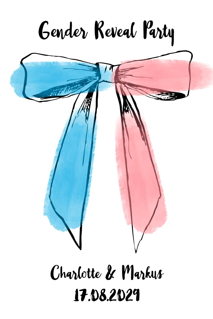Unsere einzigartige Einladung mit einer bezaubernden Zeichnung einer Schleife, die mit blauen und rosa Pinselstrichen verziert ist, ist perfekt, um das Geschlecht des Babys zu offenbaren. Diese Einladung ist ideal für alle, die eine fröhliche und lustige Feier planen. Die Kombination aus Feierlichkeit und Spaß macht diese Einladung zu einem echten Hingucker.