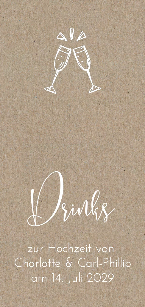 Getränkekarte zur Hochzeit aus Kraftpapier mit Sektgläsern in weiß. Die schliche Karte im Hochformat bietet auf der Rückseite Platz für Eure Hochzeitsgetränke.