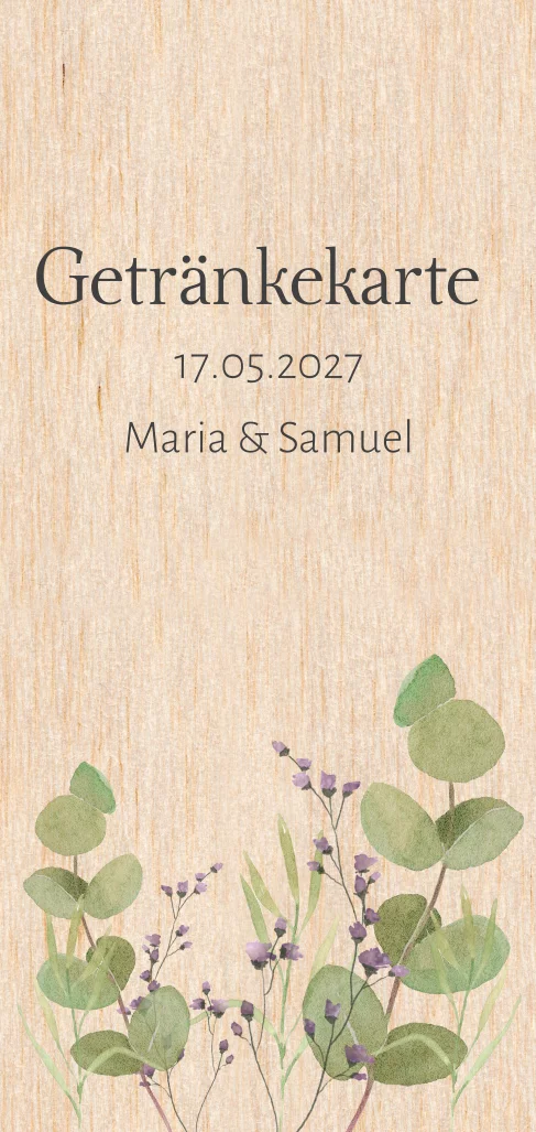 Getränkekarte zur Hochzeit aus Echtholz mit Eukalyptus und lila Blumen