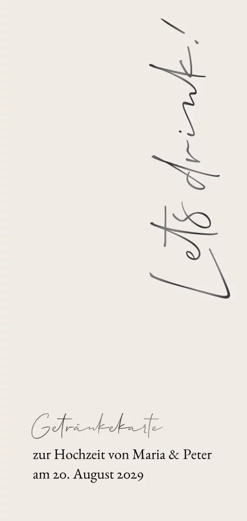 Minimalistische Getränkekarte "Let's drink!" mit schwarzer Folierung. Die Karte in beige hat abgerundete Ecken und einen modernen Touch.