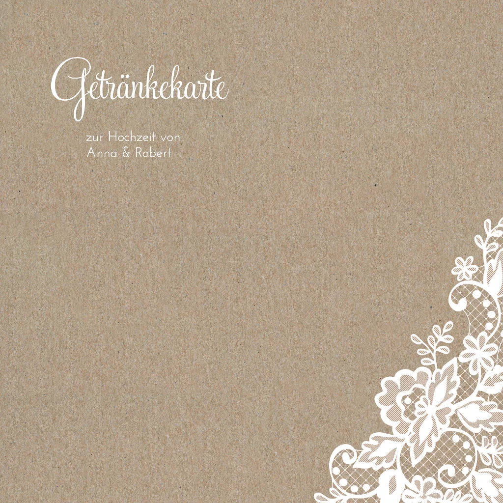Karte aus Kraftpapier als Getränkekarte zur Hochzeit. Die quadratische Karte mit Spitze bietet viel Platz für Eure Getränkeauswahl.