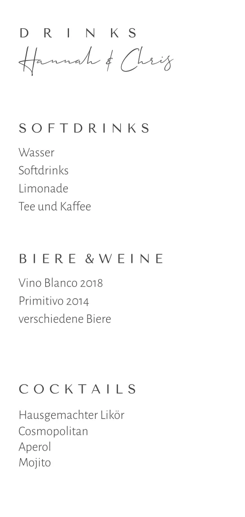 Minimalistische Getränkekarte für das Hochzeitsfest mit zarter Schrift