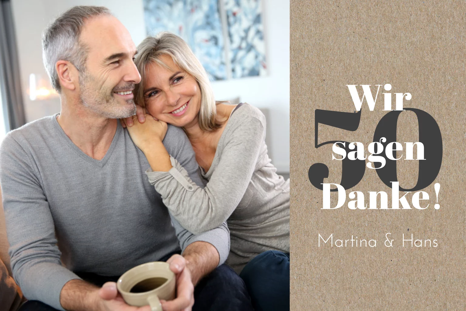 Schlichte Danksagungskarte zur Goldenen Hochzeit im Kraftpapierlook mit Foto und Zahl 50.