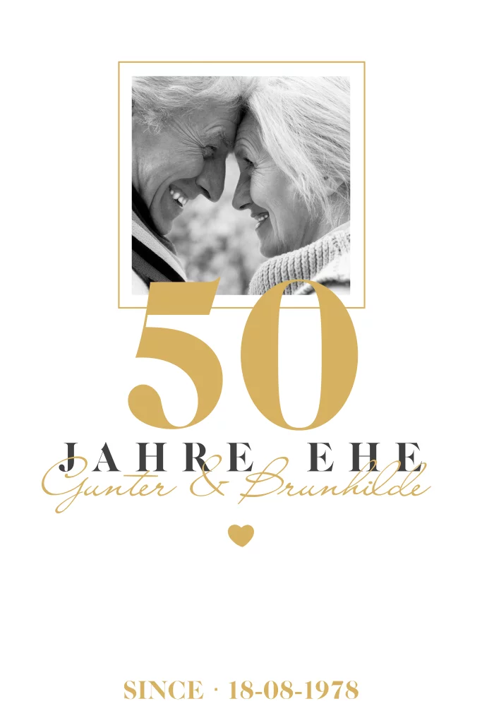 Einladung zum 50. Hochzeitstag in Form einer hochformatigen Postkarte mit goldener Zahl 50, Herz und Unendlichkeitszeichen. Die Karte wird durch Euer Foto veredelt.