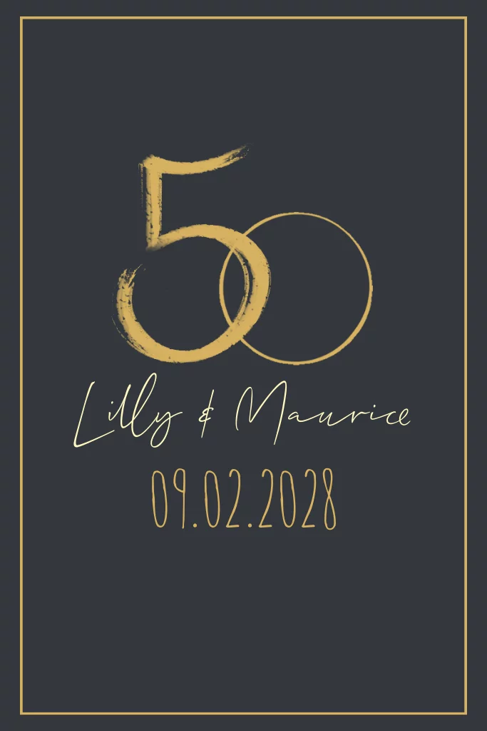 Dunkle Einladungskarte im Hochformat zum 50. Ehejubiläum. Die Vorderseite der Klappkarte wird von einem zartem Goldrahmen und der Zahl 50 geziert. Die 5 besteht aus einem Pinselstrich und die 0 stellt einen Ehering da.