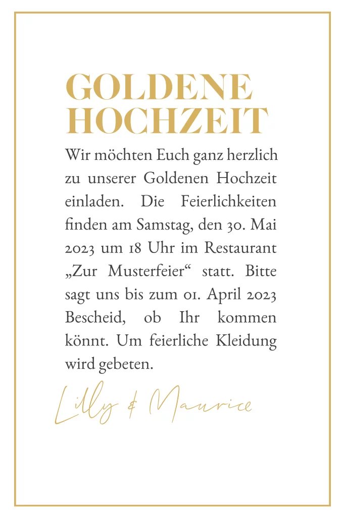 Dunkle Einladung zur Goldhochzeit mit feinem Rahmen und Pinselstrich