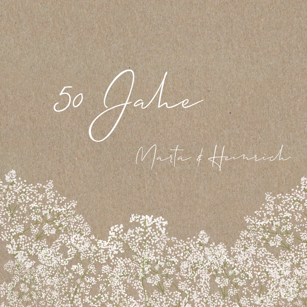 Quadratische Einladungskarte zur goldenen Hochzeit im zeitlosen Schleierkraut-Design auf Kraftpapierlook.