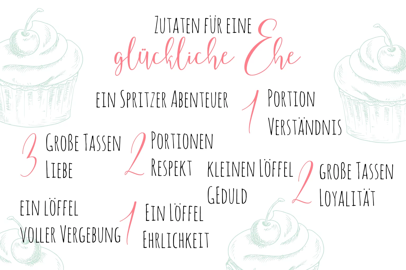 Weiße Gratulationskarte zur Hochzeit mit Rezept für eine glückliche Ehe. Die Klappkarte ist in Pastellfarben gestaltet und hat Muffins auf den einzelnen Seiten.