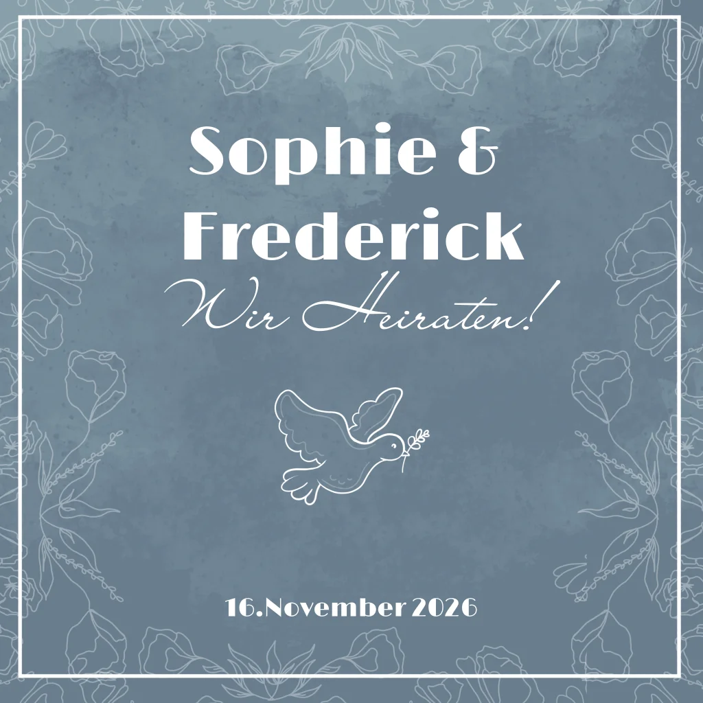 Quadratische Einladungskarte zur Hochzeit mit einem zarten Blumenrahmen und Tauben in weiß und blau.