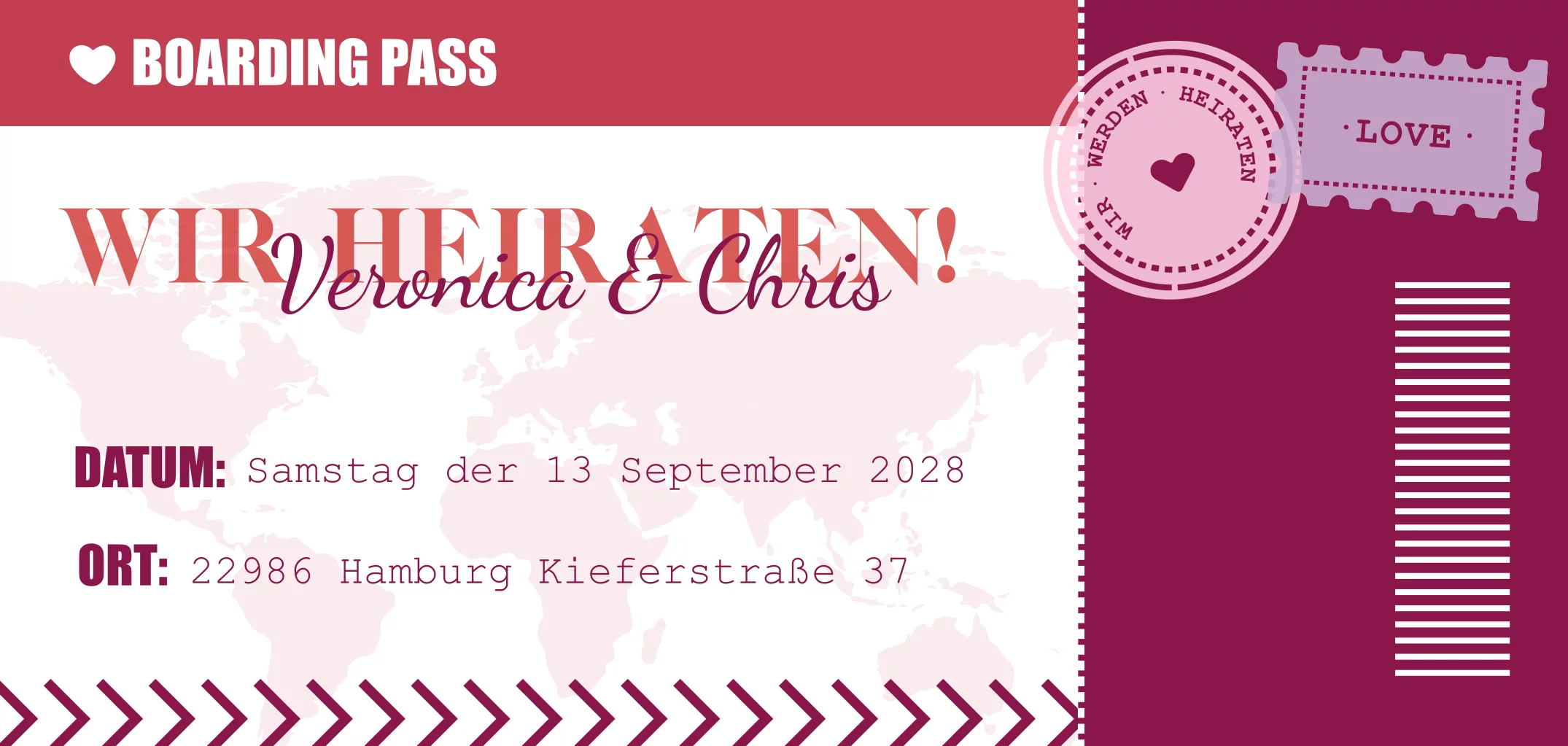 Hochzeitseinladung im Panoramaformat mal anders: Boardingpass mit Luftpost Icons in Rottönen