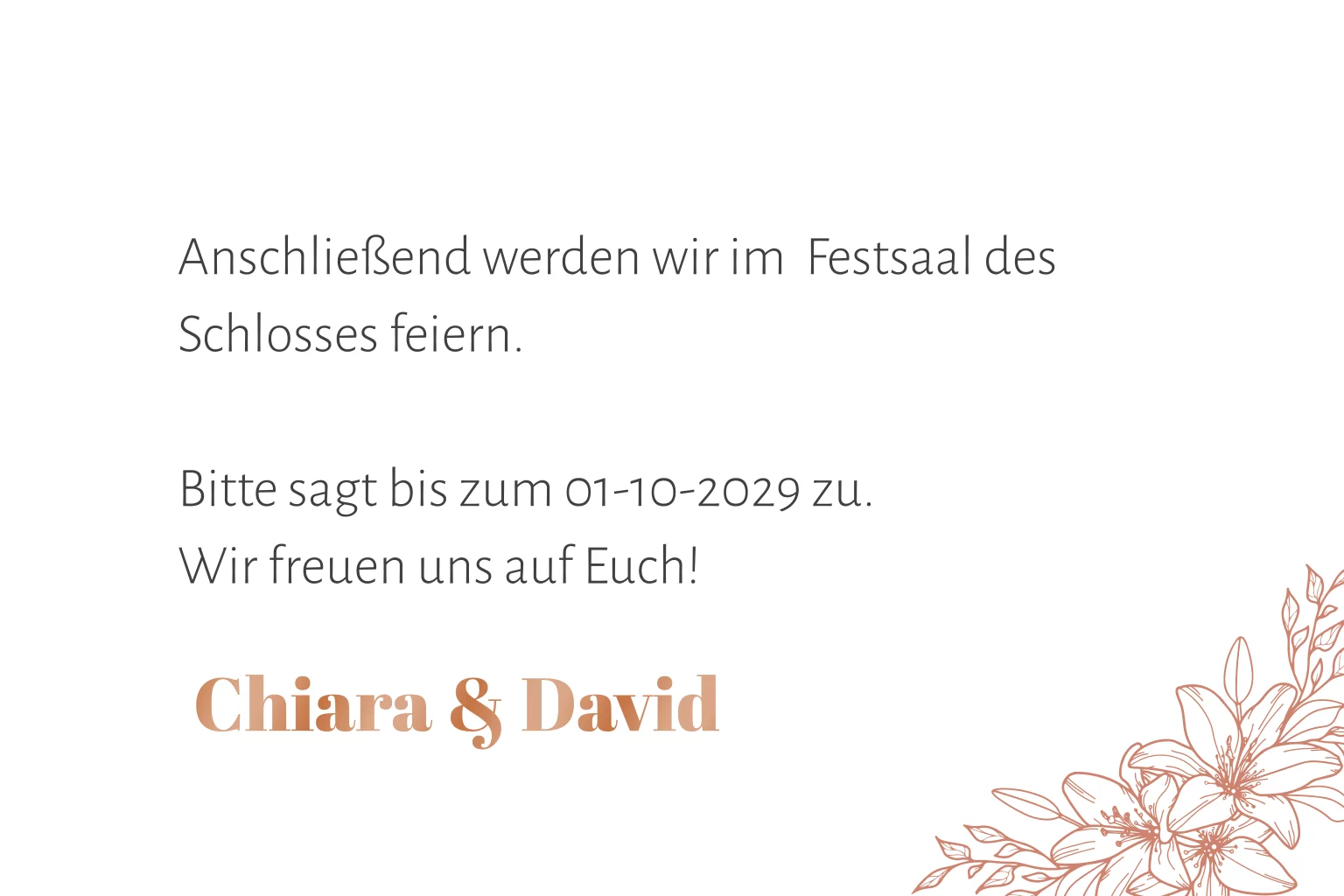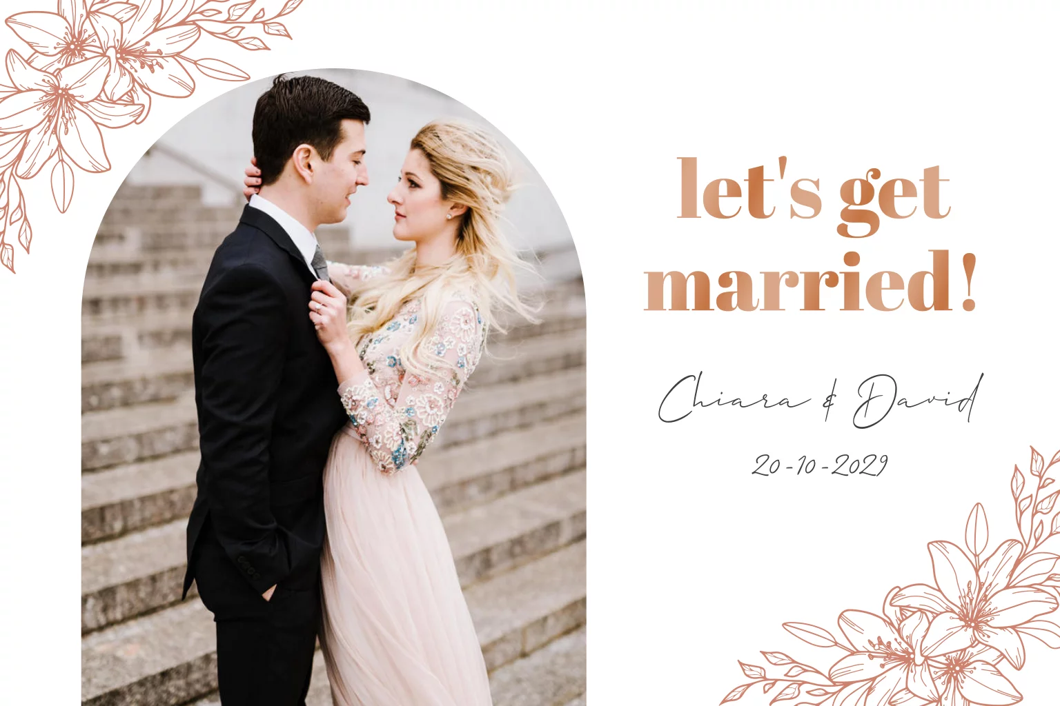 Einladung zur Hochzeit mit Foto und floralen Elementen in Line Art gestaltet. Die weiße Klappkarte mit Foto und Kupfer in Hochglanz ist im Boho-Stil gehalten.