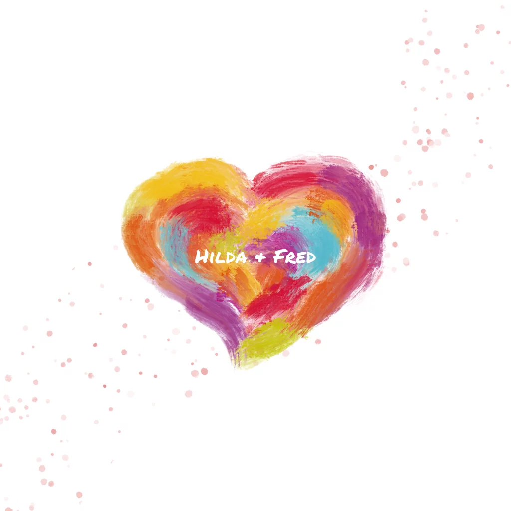 Weiße Hochzeitseinladung mit buntem Herz aus Pinselstrichen