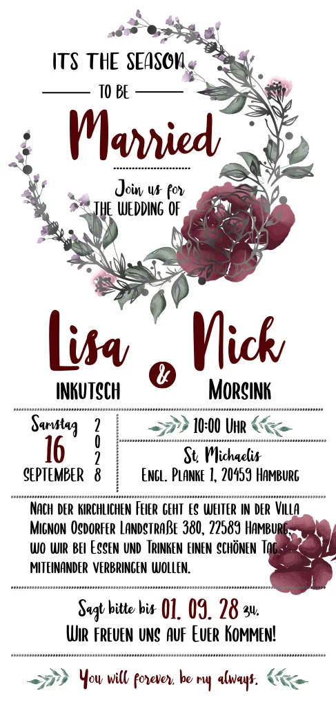 Einladungskarte zur Hochzeit im Kinokartendesign. Die weiße Karte im Panoramaformat mit Greenery- und floralen Elementen in rot und grün. Die Karte ist zudem mit schwarzer Folie veredelt.