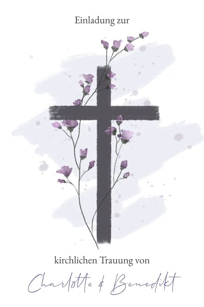 Einladungskarte zur kirchlichen Trauung mit Kreuz und abgerundeten Ecken. Die Karte mit floralen lila Akzenten besticht durch die Mischung des klassischen und modernen Designs.