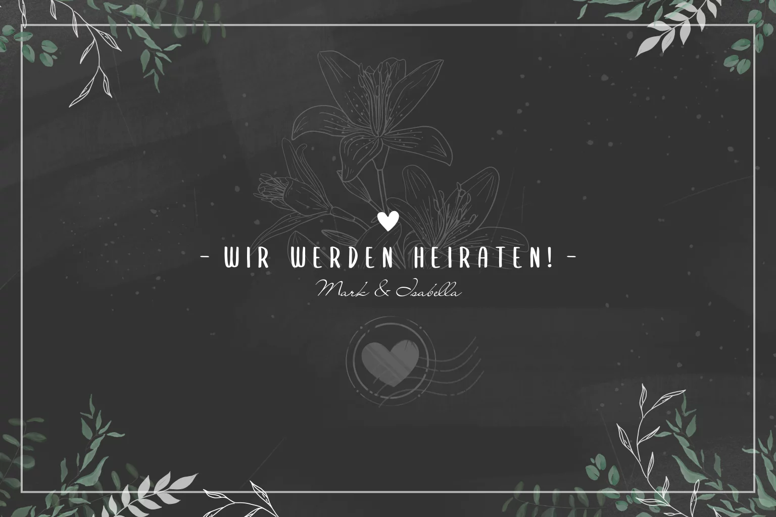 Hochzeitskarte im Schiefertafel-Look mit zartem Rahmen. Die Klappkarte ist mit feinen Greenery-Zweigen gestaltet und bietet im Innenteil der Karte Platz für Euer Verlobungsfoto.