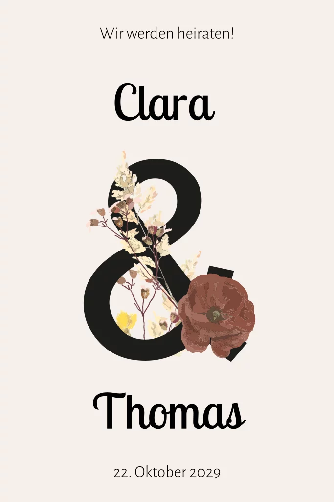 Florale Einladung zur Hochzeit mit Und-Zeichen in schwarz. Die Karte in beige ist mit Trockenblumen verziert.