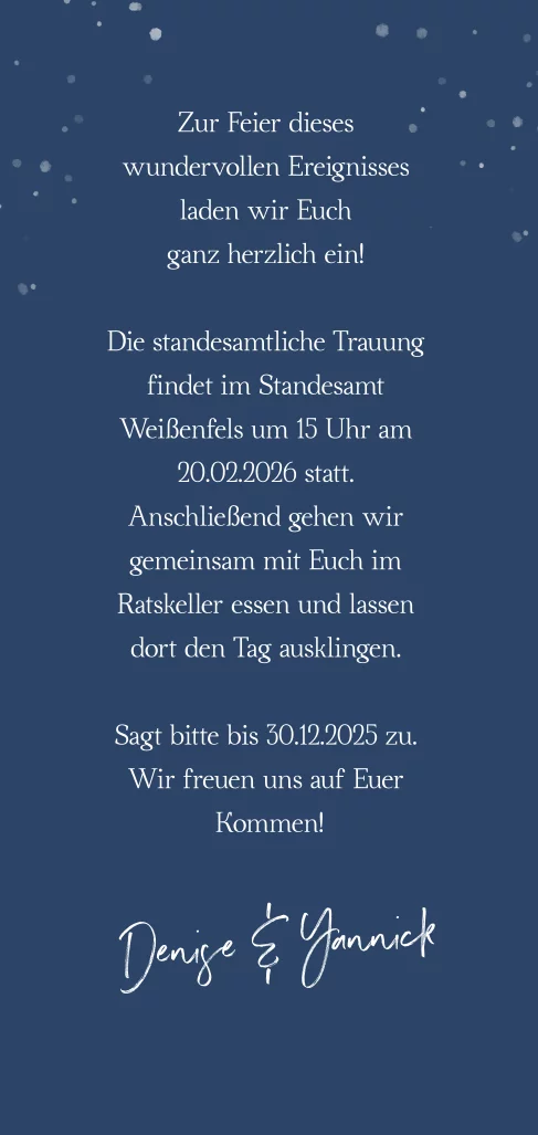 Blaue Einladung für die standesamtliche Trauung mit Schneeflocken