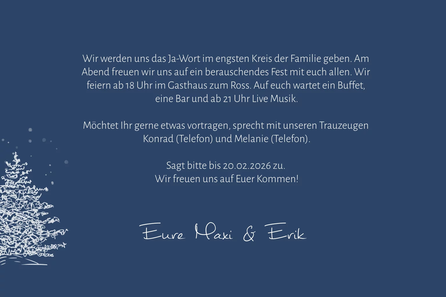 Weiße Einladung zum Standesamt als Klappkarte im Postkartenformat. Schlichtes Design, folierbar, mit schwarzen Tannenbäumen als Line Art und blauem Hintergrund auf der Innenseite.